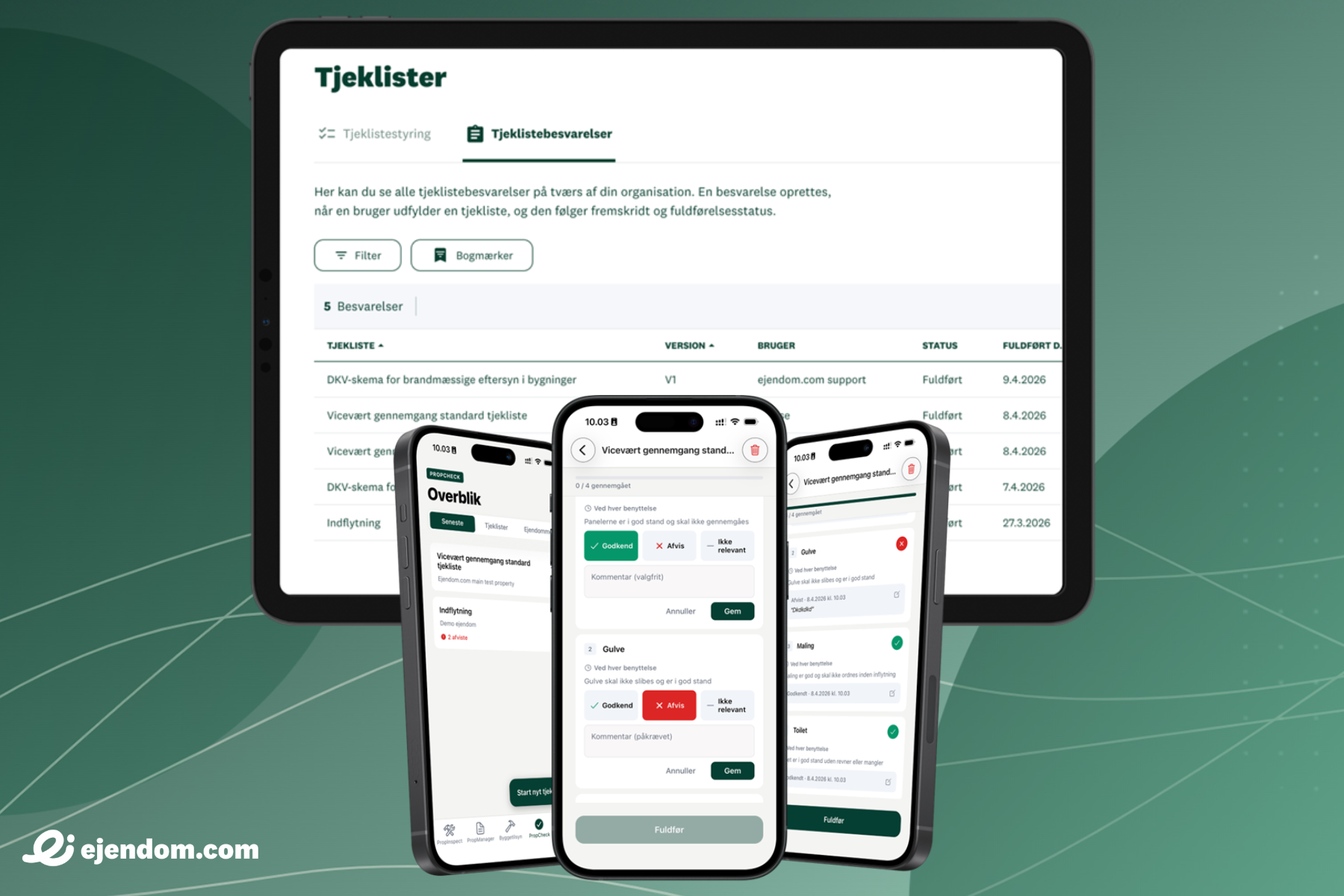 Med vores løsning, PropCheck, kan du oprette og samle alle dine tjeklister ét sted til drift, kontrol og dokumentation fx BR18 brandsikring, viceværtopgaver og servicehandinger. Det giver et bedre overblik og sikrer ensartet arbejde samt dokumentation. Du kan oprette genanvendelige punkter og samle dem i tjeklister med versionsstyring. I appen kan tjeklister udføres direkte på stedet med godkendelser, afvisninger og kommentarer, som automatisk gemmes på ejendommen. På platformen får du et klart overblik over alle besvarelser, kan hurtigt finde afvigelser og generere PDF-rapporter klar til deling.