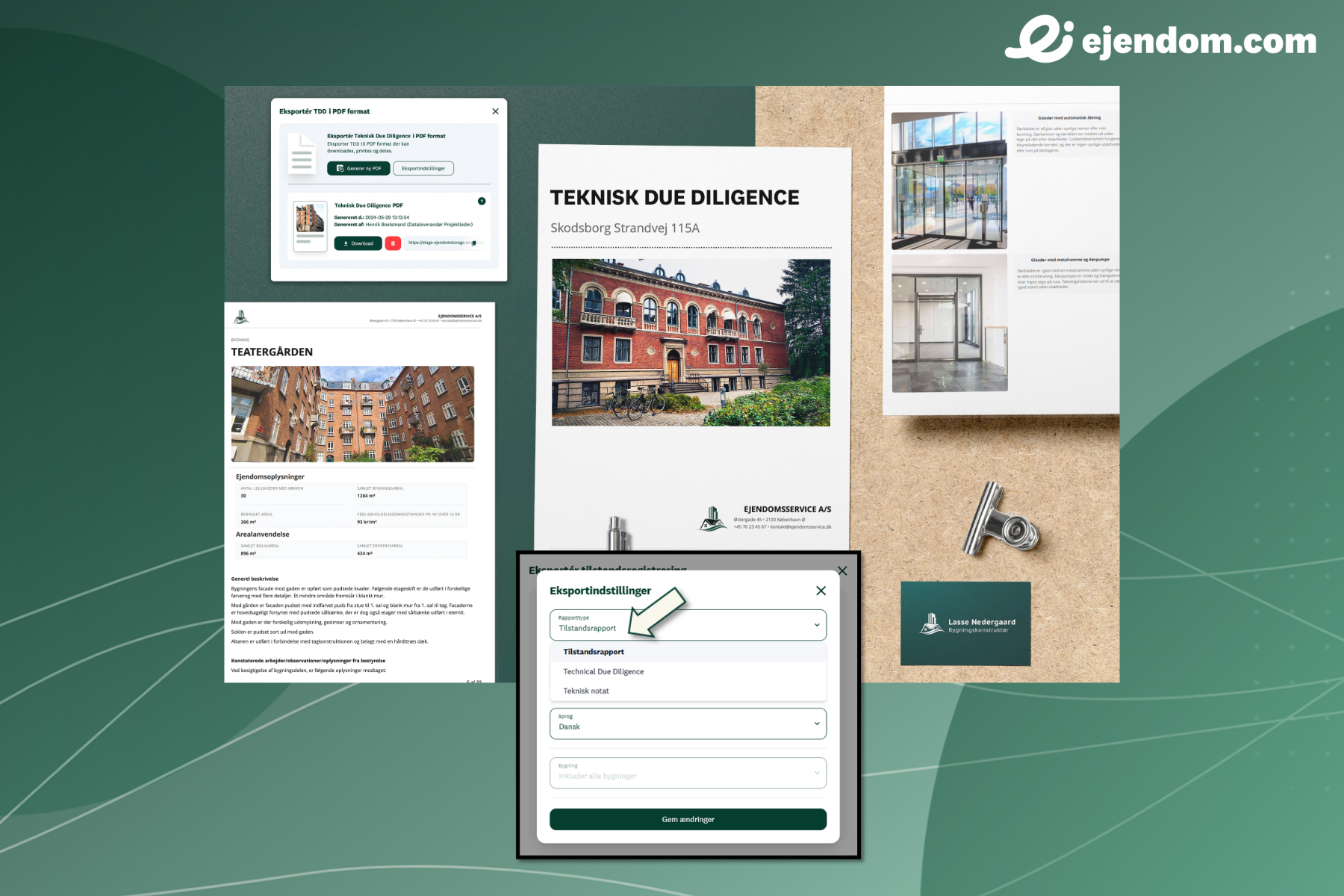 Under "Tilstandsregistrering" kan du nu ved klik på "Eksporter PDF" generere PDF-rapporter med forskellige titler såsom: Tilstandsrapport, Technical Due Diligence og Teknisk notat. I forbindelse med de nye rapporttyper er fanen "Tilstandsrapport" omdøbt til "Tilstandsregistrering", så navnet understøtter, at platformen fremover kan bruges til flere typer tekniske rapporter og inspektioner.