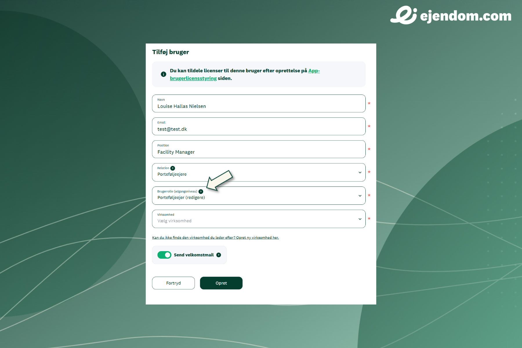 Porteføljeejer (redigere) er en ny brugertype til porteføljeejervirksomheder. Rollen er tilføjet for at give porteføljeejere mulighed for selv at redigere og tilføje data. Klik på spørgsmålstegnet, når du opretter en bruger, for at se de forskellige rettigheder.