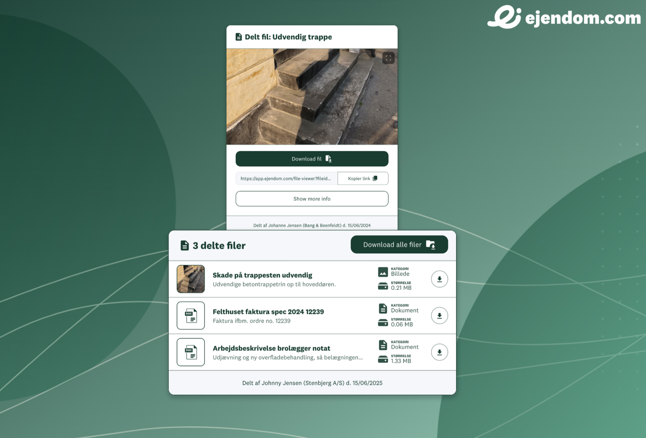 Det er nu muligt at dele en fil eller en filpakke med eksterne via et delbart link, som I kender det fra delingen af tilstandsrapporten som PDF. Linket kopieres, og alle med linket kan tilgå filerne uden at det er nødvendigt at have en bruger på ejendom.com. Læs mere om PropDoc her.